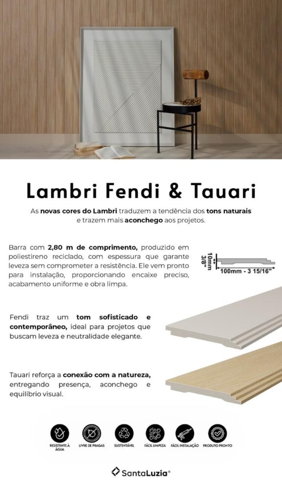 É nesse cenário que a Santa Luzia apresenta dois lançamentos estratégicos: o Lambri nas cores Fendi e Tauari e o Ubá Branco — soluções que combinam estética contemporânea, praticidade e um forte apelo sustentável.